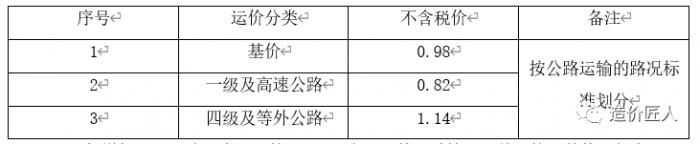 注:如增加運距影響因素,可按20km以內和以外兩種情況調整,按照基價進行上浮和下浮,浮動幅度參考0.1元/公里.噸。